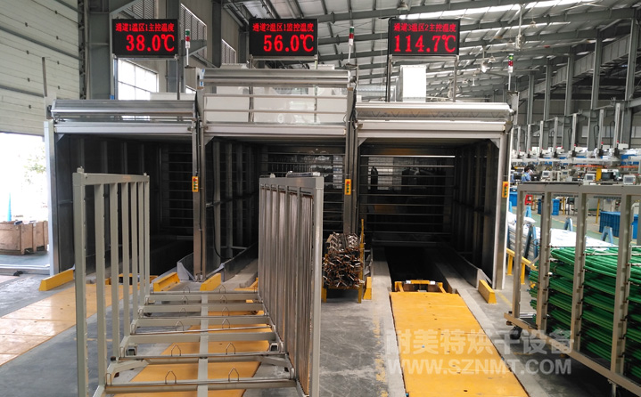 每個小車分10層堆放日豐管,每層放6包,則每車可放60包,每包重約28KG,烘烤區(qū)域分3個獨立通道,可以單獨控溫,每個通道烘烤區(qū)可以放置6輛小車,每個通道每20分鐘出一輛小車,小車自動進出。小車由客戶自行設計制作。